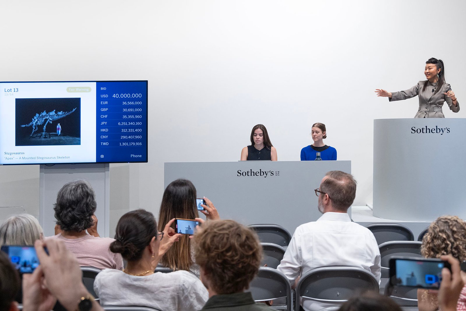 It was the auction that reverberated throughout the world. Apex the Stegosaurus, a rare 161-million-yearold dinosaur skeleton, sold at Sotheby’s last July for a record-breaking US$44.6 million after an intense 15-minute bidding war. But it wasn’t just the fossil or its historic sale price (more than 11 times the estimate) that made waves — Sotheby’s auctioneer Phyllis Kao, as emcee, presided over it all. And her star-turn performance — streamed live online and on TikTok for millions of viewers — almost eclipsed the mammoth skeleton.